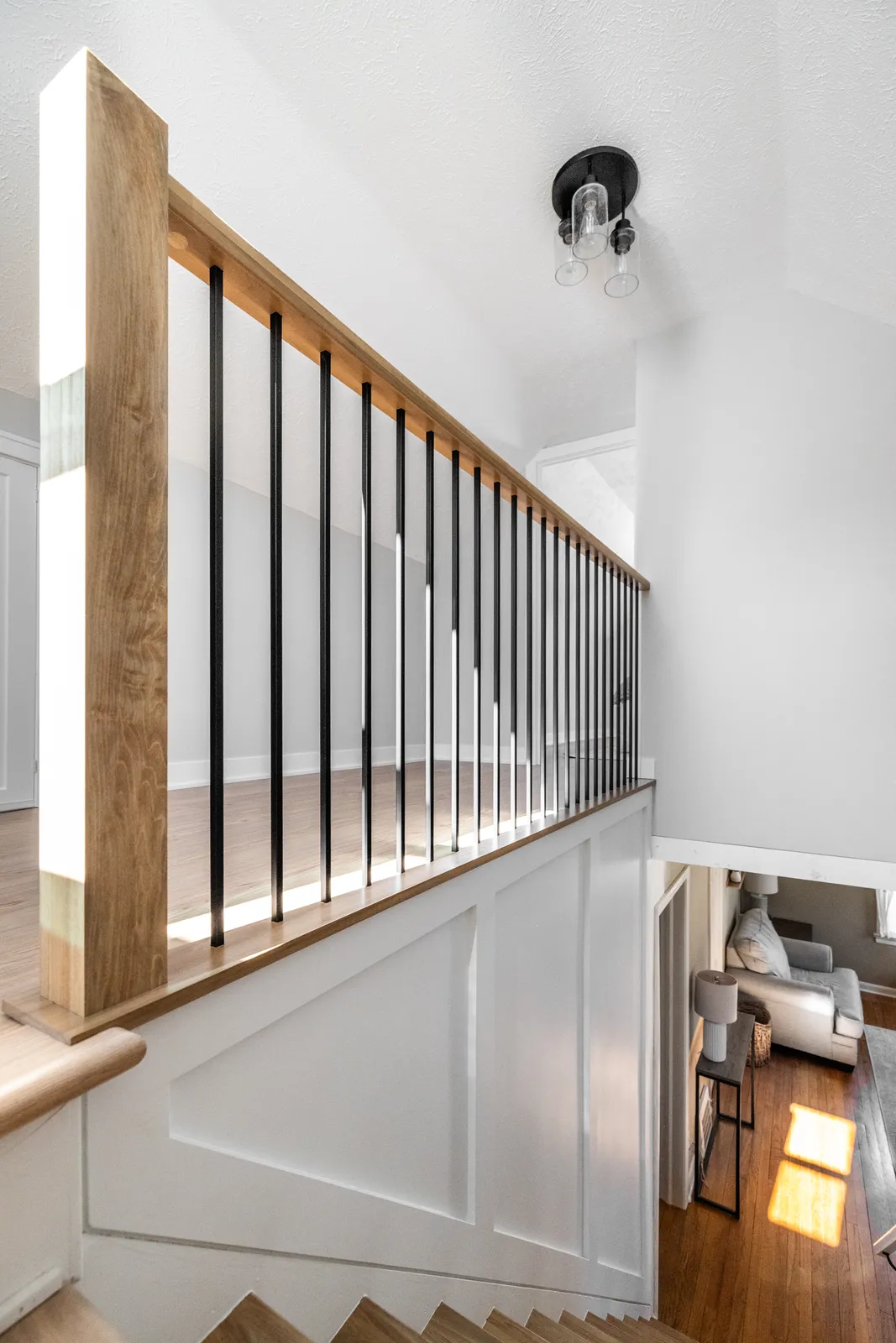 - Walnut railing cap with iron spindle system and wainscoting